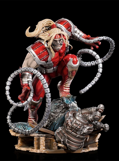 Emergiendo en pedazos rotos, entre los escombros de los cimientos de Mansion X, Iron Studios revela el mutante rojo-blanco conocido como Omega Red, para agregar su colosal BDS (diorama de batalla) """" """" X-Men vs. Centinelas """" """". Ex soldado y convicto asesino en serie de la antigua URSS, el mutante Arkady Gregorivich Rossovich fue utilizado en un proyecto de súper soldado soviético que dejó su piel blanca y lo convirtió en un cyborg con tentáculos retráctiles implantados en sus brazos, hechos de dióxido de carbono. radioactivos (una variación maleable de adamantium), que usan como armas o para drenar la fuerza vital de sus víctimas. Los implantes de dióxido de carbono son grandes armas, pero también te envenenan lentamente, por lo que tiene que drenar regularmente la energía vital, o tome pequeñas cantidades de varios individuos para mantener temporalmente su sistema inmunológico, por lo que esta tendencia vampírica es esencial para su supervivencia.